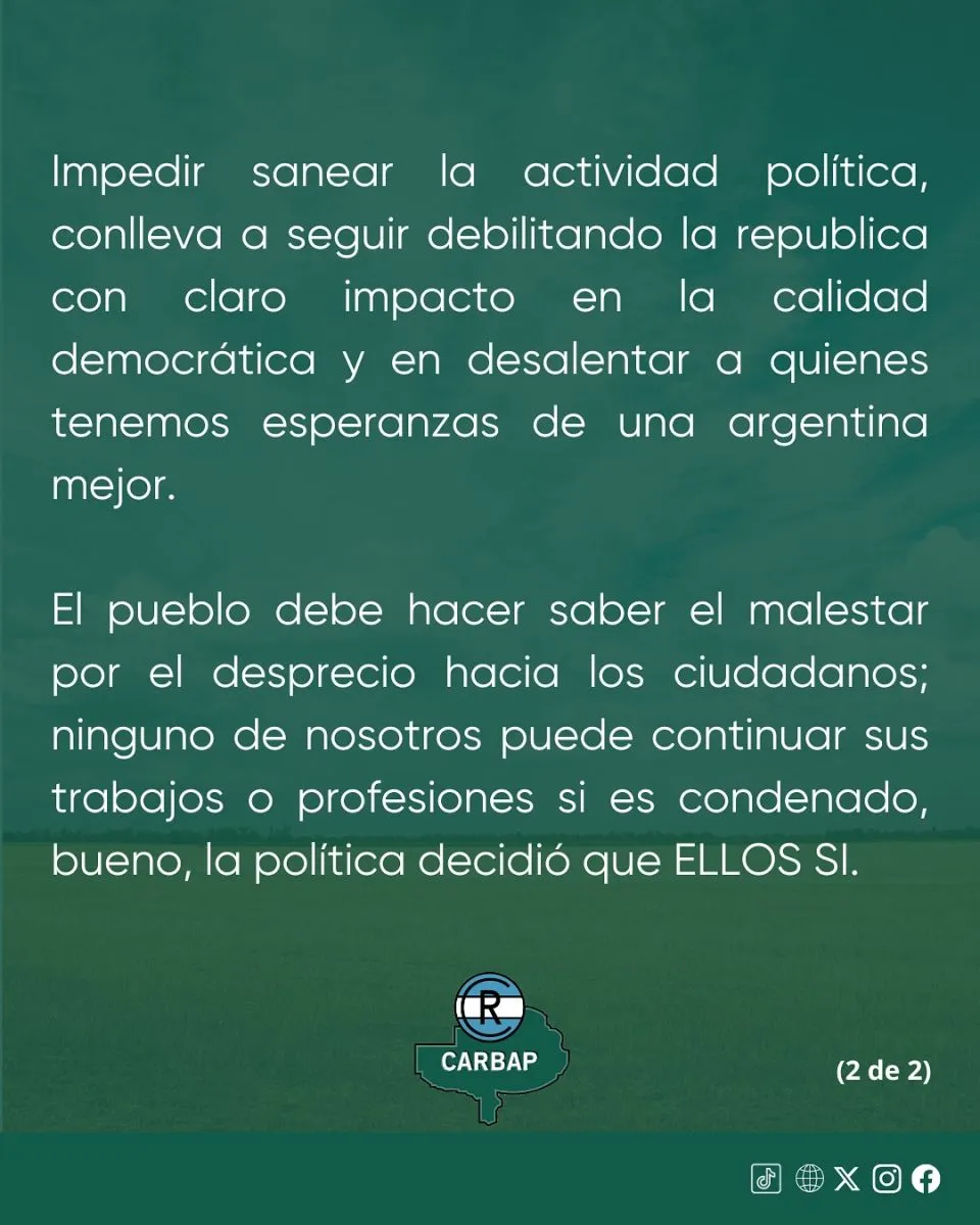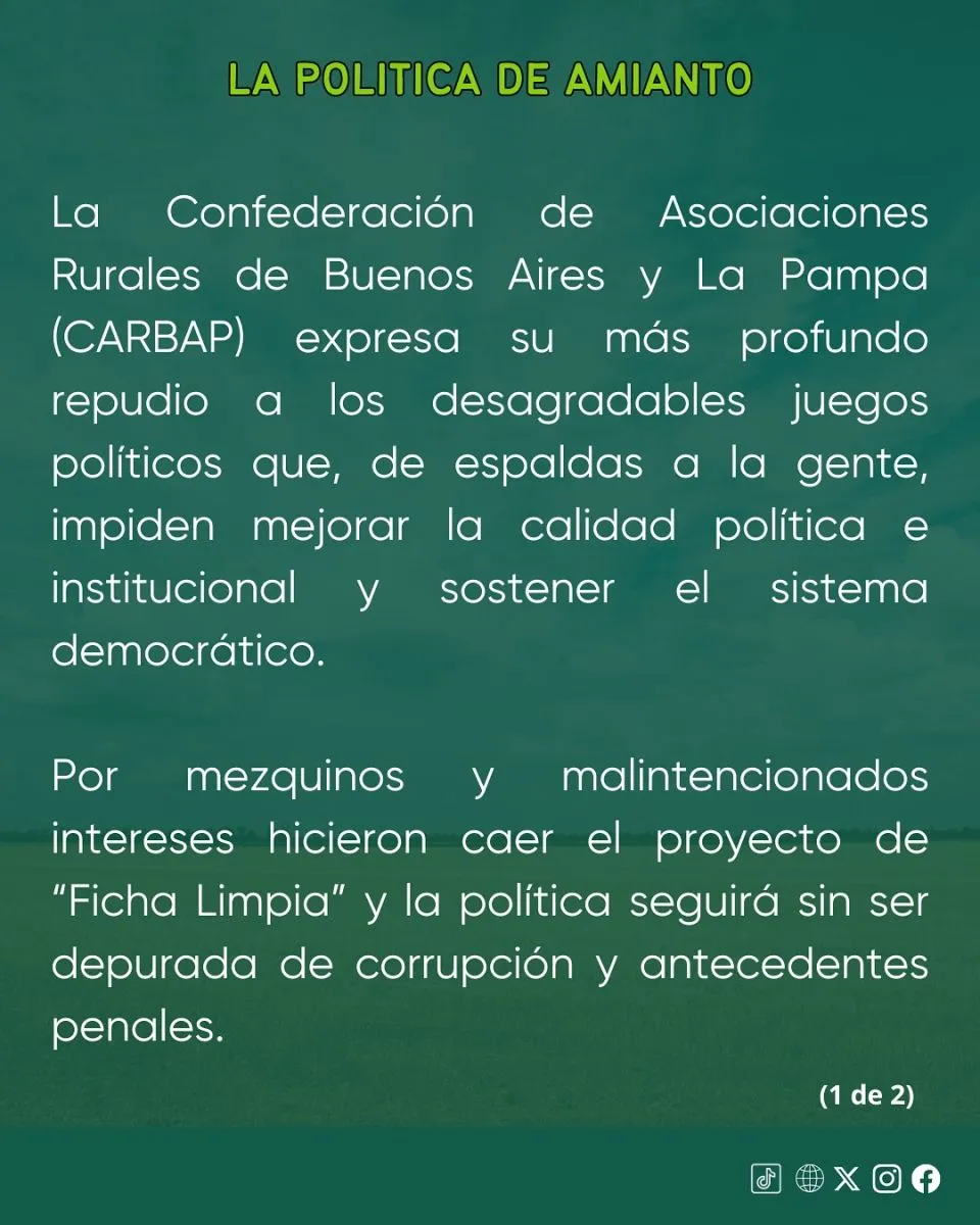 Después de la caida en Senadores del proyecto "Ficha Limpia" que establecía la prohibición de ser candidatos a las personas condenadas por delitos de corrupción, y ante las muchas versiones de arreglos y contubernios, la entidad ruralista CARBAP emitió el siguiente comunicado:
