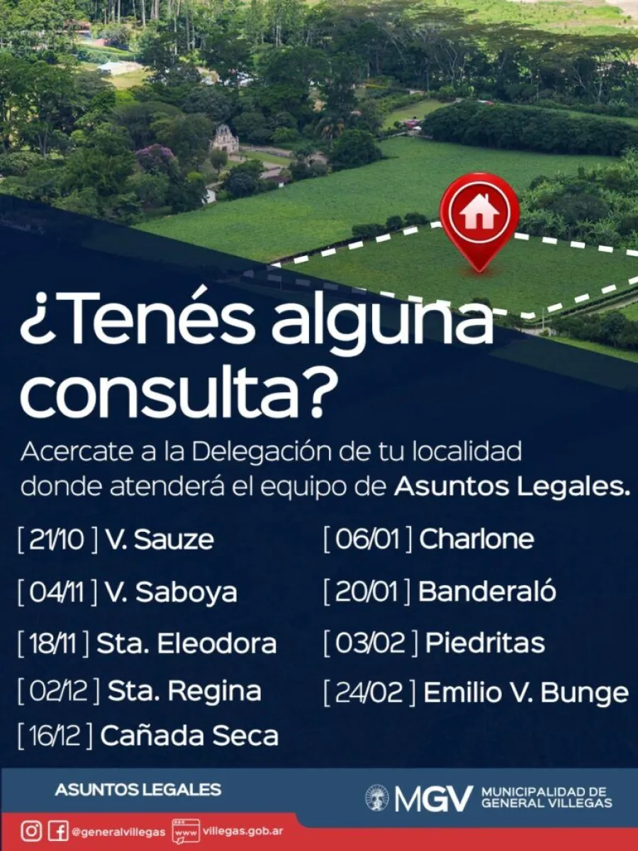 El área de asuntos legales del municipio estará recibiendo consultas en los distintos pueblos del Partido de General Villegas, de acuerdo al siguiente cronograma.