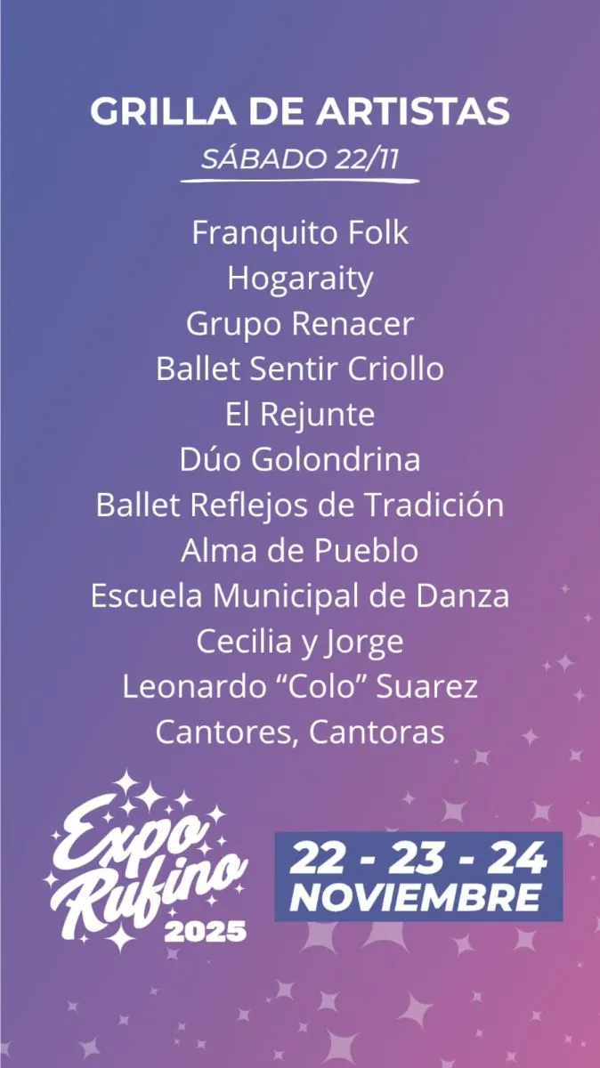 En un comunicado a los medios, la Municipalidad de Rufino anunció la grilla de artistas locales que acturán durante el fin de semana del 22, 23 y 24 de noviembre.