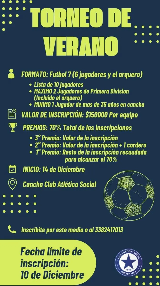 A continuación detalles de reglamento, premios y condiciones para el campeonato de verano que organiza el Club Atlético Social Cañada Seca.