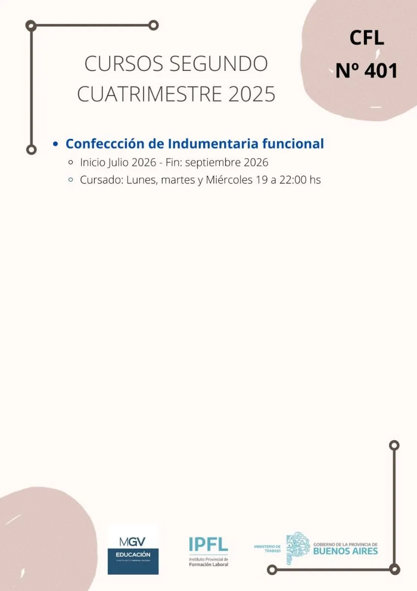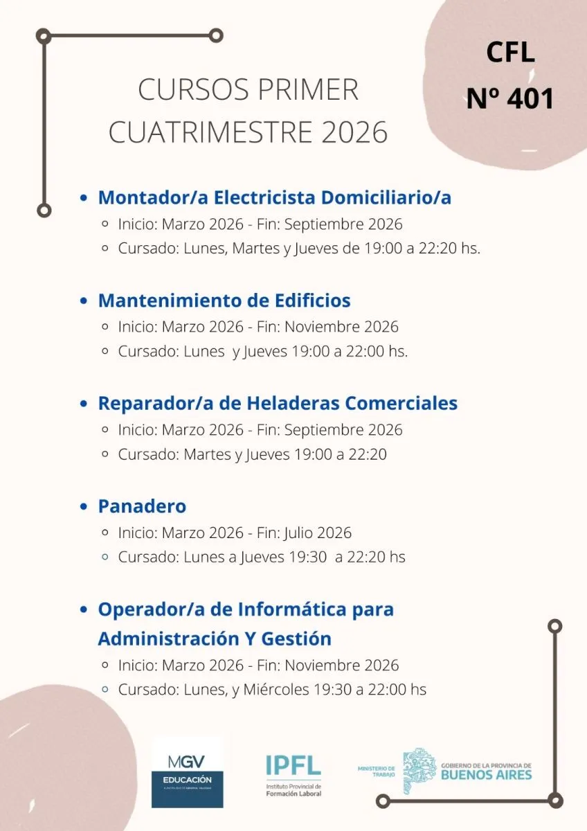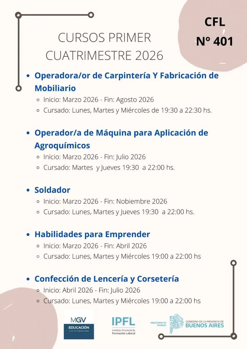 EDUCACION Ofertas de cursos en el Centro de Formación laboral El CFL N° 401 de General Villegas presenta las distintas opciones de formación para 2026. Campartí esta nota: Campartí esta nota: • General jueves 26 de febrero de 2026 Te puede interesar TECNOLOGIA Y DELITO Nudificación: Nueva trampa digital que desnuda más que cuerpos COMPRAS ON LINE Nueva forma de estafa en compras por plataformas PIROTECNIA La Municipalidad recuerda la prohibición de uso y comercialización de pirotecnia de alto impacto sonoro COMUNICADO PAMI informa sobre provisión de pañales SEGURIDAD Estafas telefónicas SALUD Septiembre: mes de prevención del suicidio Últimas noticias PARTIDO DE GENERAL VILLEGAS Cronograma para obtener licencias de conducir en los pueblos del Partido VOLEY Jovenes cañadenses participaron de encuentro en Laboulaye con el plantel de Sportivo Ben Hur RUFINO Maratón de Rufino 2026 LIGA DE FUTBOL DE GENERAL VILLEGAS Se conoció el fixture de Torneo apertura