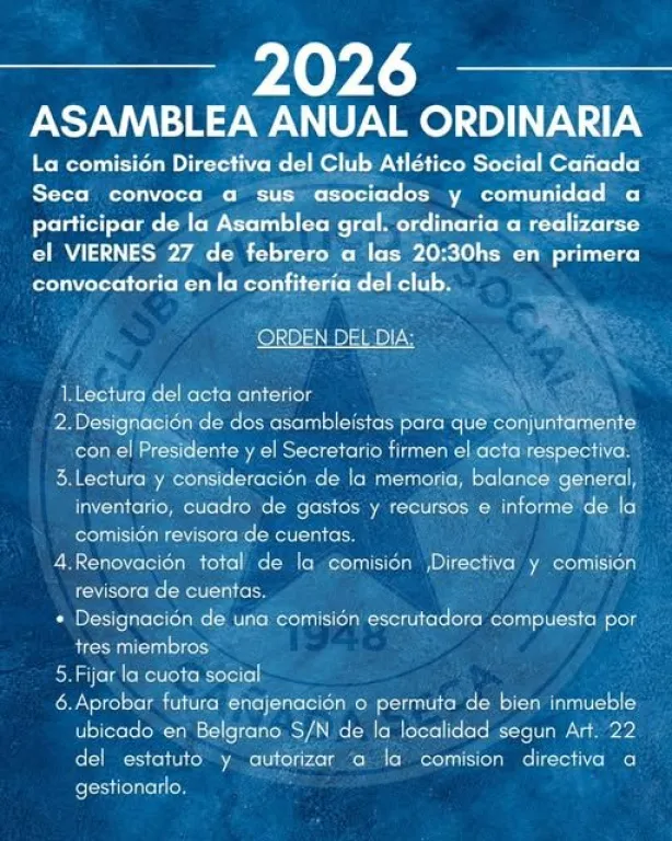 CAÑADA SECA Asamblea del Club Atlético Social El viernes 27 se realiza la Asamblea Anual Ordinaria del Lagunero Campartí esta nota: Campartí esta nota: • Locales viernes 27 de febrero de 2026 Te puede interesar CAÑADA SECA Verano cultural el fin de semana CAÑADA SECA Asamblea del CAPS y Hogar de Ancianos MEDIO AMBIENTE Castraciones en Cañada Seca OFICINA MOVIL Anses y Pami en Cañada Seca CAÑADA SECA Importantes anuncios para instituciones cañadenses CAÑADA SECA Cerró el programa Escuelas Abiertas en Verano Últimas noticias PARTIDO DE GENERAL VILLEGAS Cronograma para obtener licencias de conducir en los pueblos del Partido VOLEY Jovenes cañadenses participaron de encuentro en Laboulaye con el plantel de Sportivo Ben Hur RUFINO Maratón de Rufino 2026 LIGA DE FUTBOL DE GENERAL VILLEGAS Se conoció el fixture de Torneo apertura