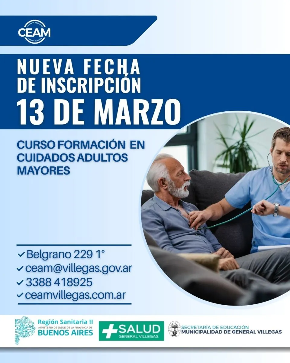 La Secretaría de Educación de la Municipalidad de General Villegas, en conjunto con el Hospital Municipal, informa que se prorrogó hasta el jueves 13 de marzo la inscripción y la entrega de documentación para el Curso de Operador de Cuidados de Adultos Mayores.