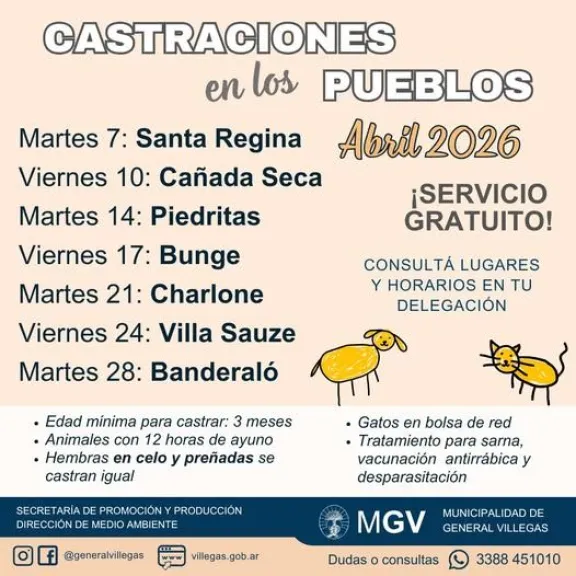 El servicio municipal de castraciones trabajará en los distintos pueblos del Partido