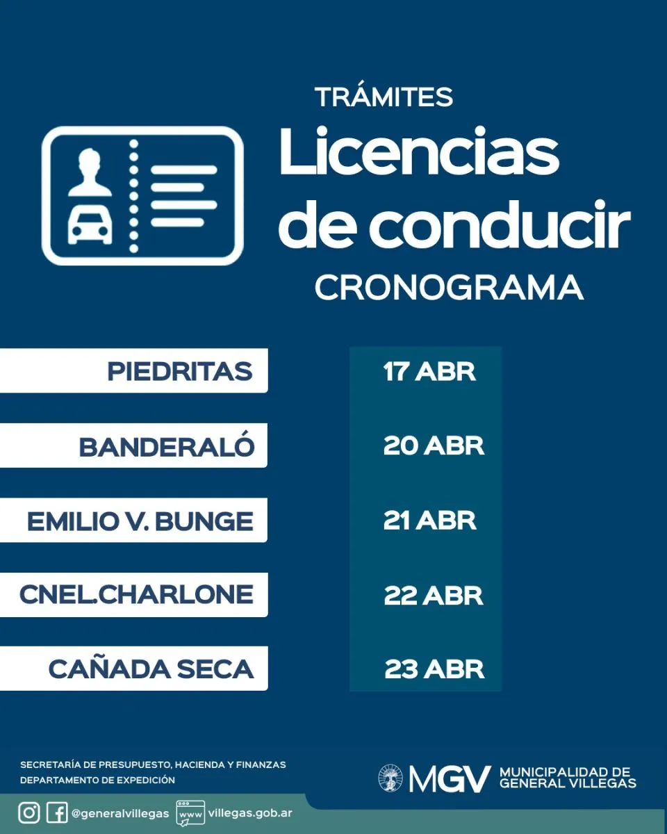 En abril se podrán gestionar licencias originales, renovaciones, duplicados, reemplazos y ampliaciones.  Los mayores de 80 años  y licencias  profesionales tienen que gestionarlas en General Villegas.El cronograma es el siguiente: